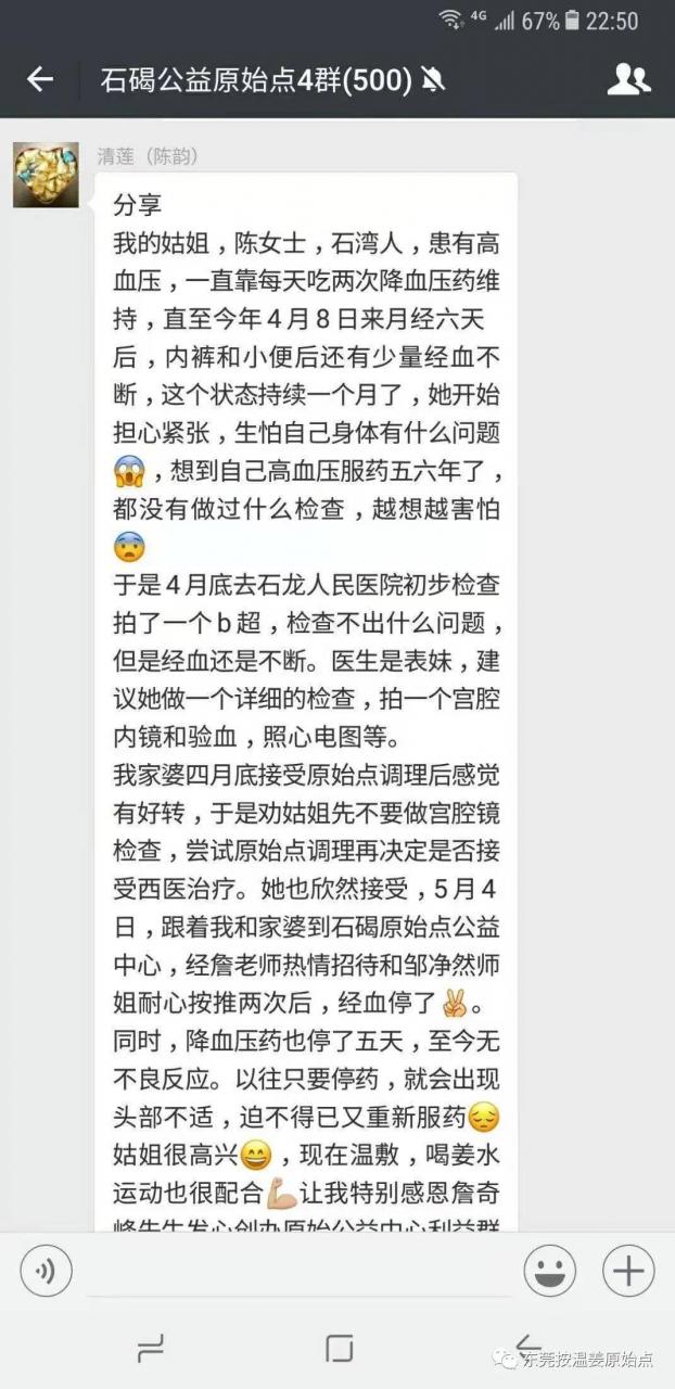我家婆四月底接受原始点调理后感觉有好转,于是劝姑姐先不要做宫腔镜检查,尝试原始点调理再决定是否接受西医治疗。她也欣然接受,5月4日,跟着我和家婆到石碣原始点公益中心,经詹老师热情招待和邹净然师姐耐心按推两次后,经血停了。同时,降血压药也停了五天,至今无不良反应。以往只要停药,就会出现头部不适,迫不得已又重新服药