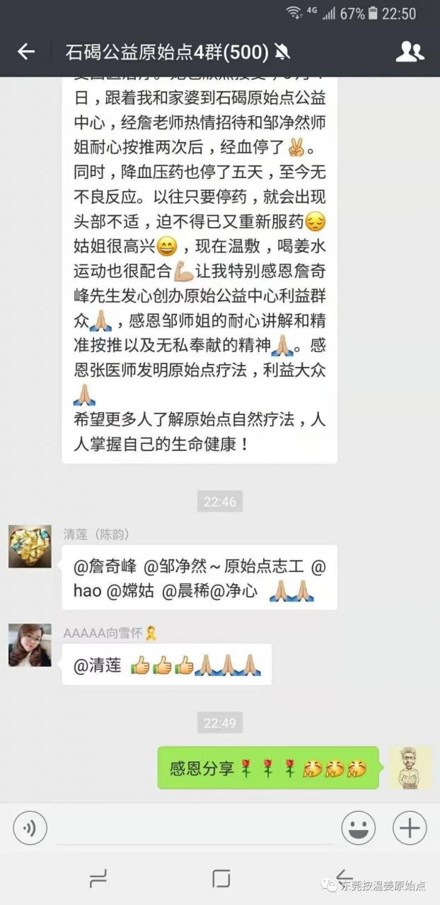 姑姐很高兴,现在温敷,喝姜水运动也很配合让我特别感恩詹奇峰先生发心创办原始公益中心利益群众,感恩邹师姐的耐心讲解和精准按推以及无私奉献的精神。感恩张医师发明原始点疗法,利益大众。希望更多人了解原始点自然疗法,人人掌握自己的生命健康。