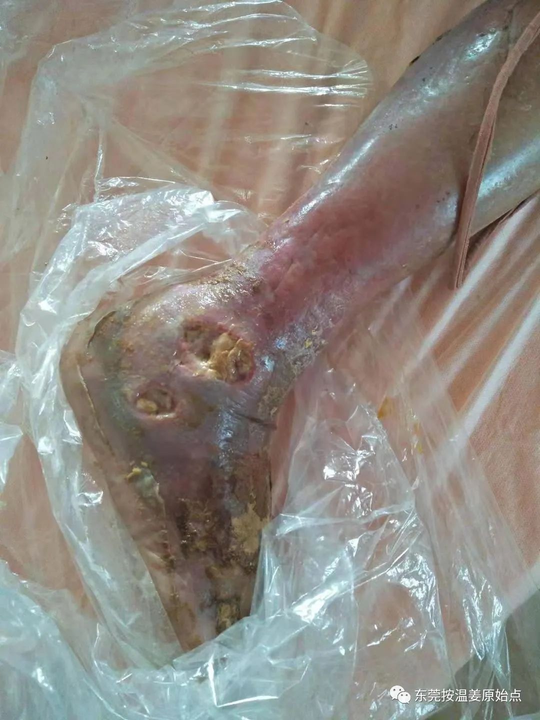 苏爷爷的大儿子苏先生之前有受益于原始点,他坚持要带他爸爸过来石碣公益点调理,但其他大部分家人、同村的乡亲都反对,觉得的年纪这么大了,而且医院也治不好这么严重的病,就没必要再折腾老人家了,包括苏爷爷本人也心情低落,觉得不可能好了,而且年纪也这么大,反对继续治疗。苏先生排除各方面的困难,坚持让苏爷爷出院。从12月1号出院~12月7号在家先用姜粉撒抺在伤口上,12.7过来石碣公益点时,腿的水肿已经有部分消退。
