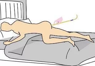 嘱患者铺浴巾躺在床边,嘱患者侧躺并将上面的腿自然弓起,露出臀部。不可离卫生间太远,或可备便桶在旁。
