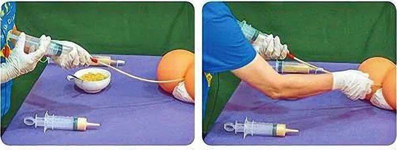 ②先用注射器吸姜粉泥推入鼻胃管或灌肠管,然后将注射器与鼻胃管或灌肠管脱开,并拉出注射器活塞, 再重新连接鼻胃管或灌肠管,将管内剩余的姜粉泥推入肠内。如遇阻力太大推不进去,可把鼻胃管或灌肠管适当拉出一些再推,或多准备一支空的注射器,利用空气把管内的姜粉泥推进肠道,两支注射器交替使用,直至最后完成灌肠。