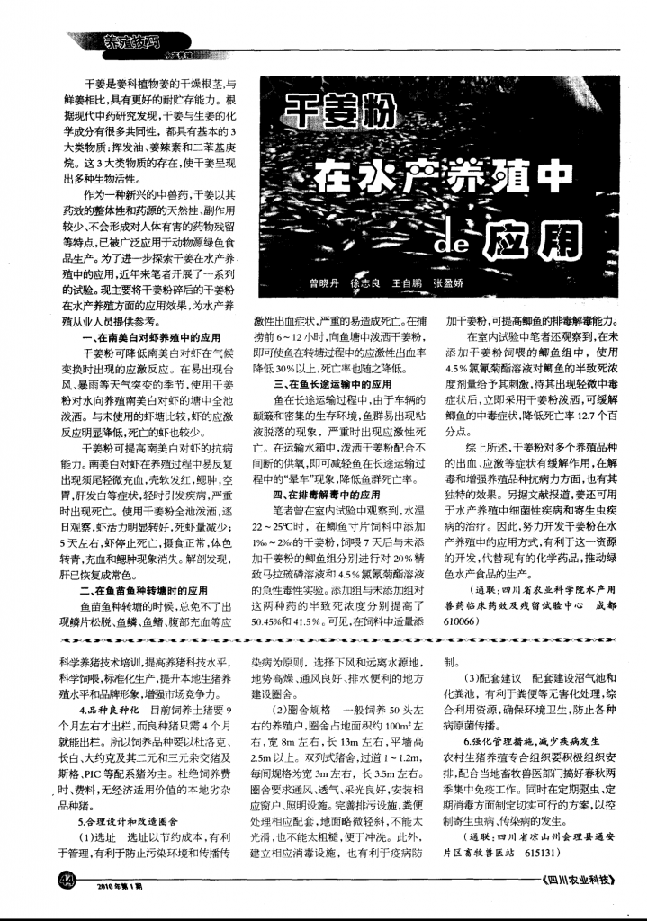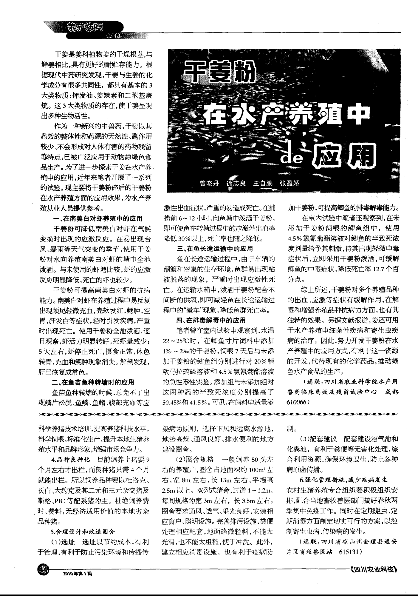 作为一种新兴的中兽药,干姜以其药效的整体性和药源的天然性、副作用较少、不会形成对人体有害的药物残留等特点,已被广泛应用于动物源绿色食品生产。为了进一步探索干姜在水产养.