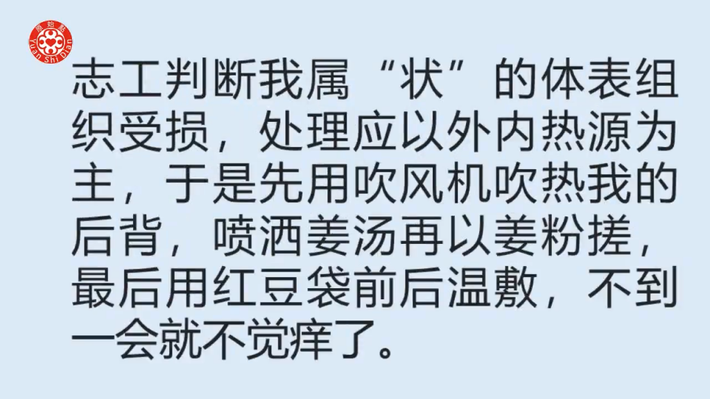 志工判断我属“状”的体表组织受损,处理应以外内热源为主,于是先用吹风机吹热我的后背,喷洒姜汤再以姜粉搓,最后用红豆袋前后温敷,不到一会就不觉痒了。