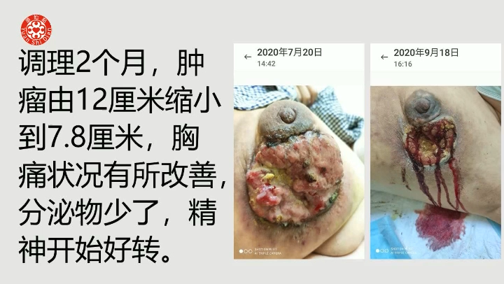 2020年12月4日调理5个月,肿瘤缩小到4厘米,胸部已经不再疼痛,分泌物更少,精力充沛。目前还在继续调理中……
