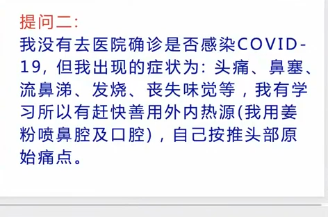 我没有去医院确诊是否感染COVID-19,但我出现的症状为:头痛、鼻塞、流鼻涕、发烧、丧失味觉等,我有学习所以有赶快善用外内热源(我用姜粉喷鼻腔及口腔),自己按推头部原始痛点。