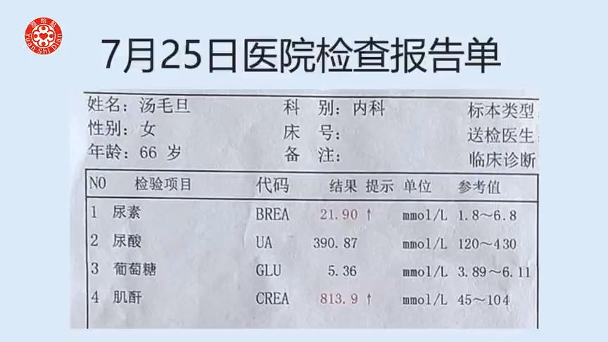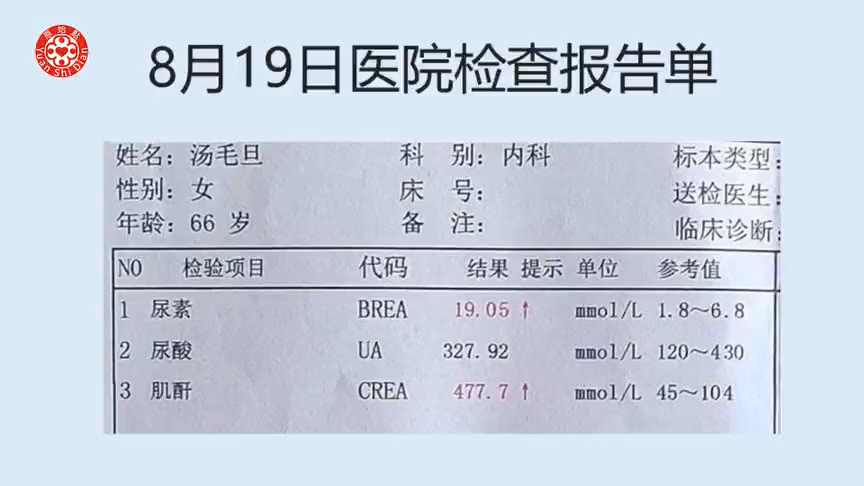 2020年7月25日到医院检查,发现胃有8个息肉,还有炎症、贫血现象,肾脏也有问题,肌酐指数高达813。医院判断母亲有尿毒症,要做透析治疗。