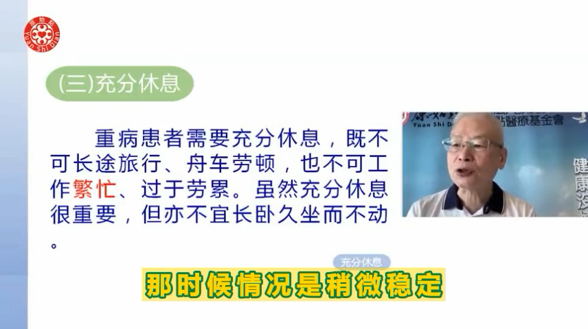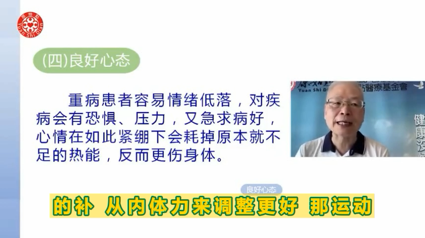总之,重病患者日常应以运动及休息为主,放松身体,缓慢调息,随时活动,不可过累,累了就睡,但亦不宜久躺久坐。如此落实,等热能渐充,体力转佳,体改善,各种疾病症状自然都可自愈。