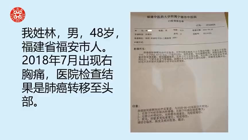 - 40. 肺癌转移案例 林成财先生48岁福建福安人 2020年11月11日来到公示公益点调理,两个星期后,身体所有症状完全消失。