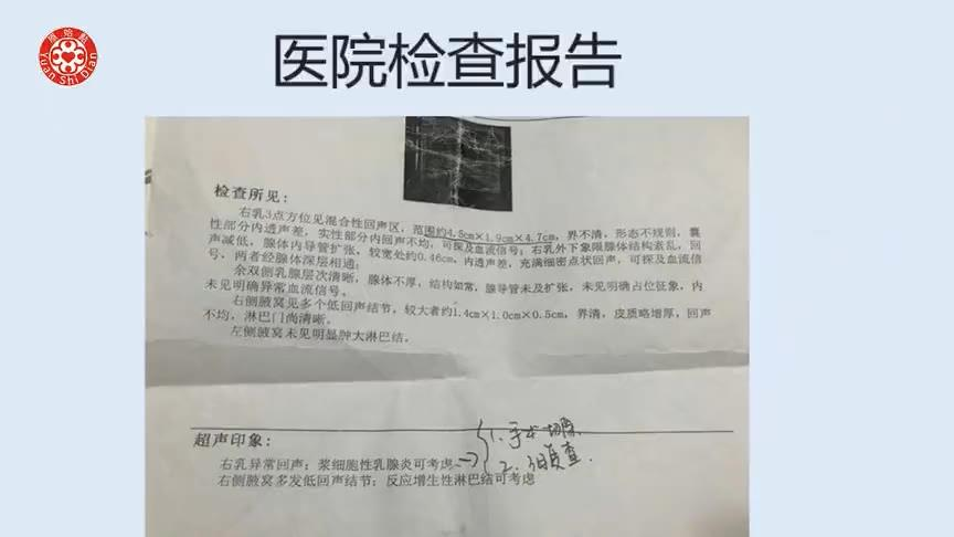 2020年4月18日,我因右侧乳房硬块红肿疼痛到医院做超声波检查,确诊为浆细胞性乳腺炎。医生建议先输液治疗,再进行乳房切除手术。