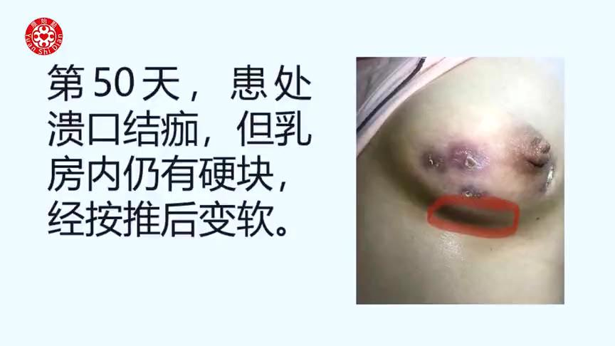 第50天,患处溃口结痂,但乳房内仍有硬块,经按推后变软。