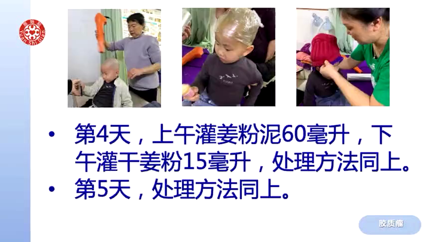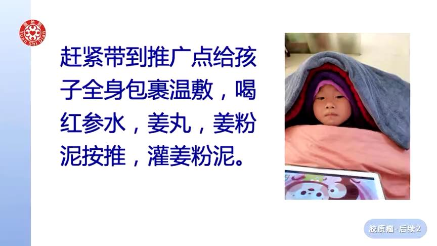 用风筒吹整个头部40分钟,用姜油对5滴麻油加8滴浓缩姜汁轻轻涂抹整个头部,再用毛巾包上红豆帽在头部温戴半小时。吸小朋友喝姜丸10粒。交代家长不可以吃水果,寒凉的饮食不可以再吃,只能吃温热饮食。晚上回家睡温敷床垫37度