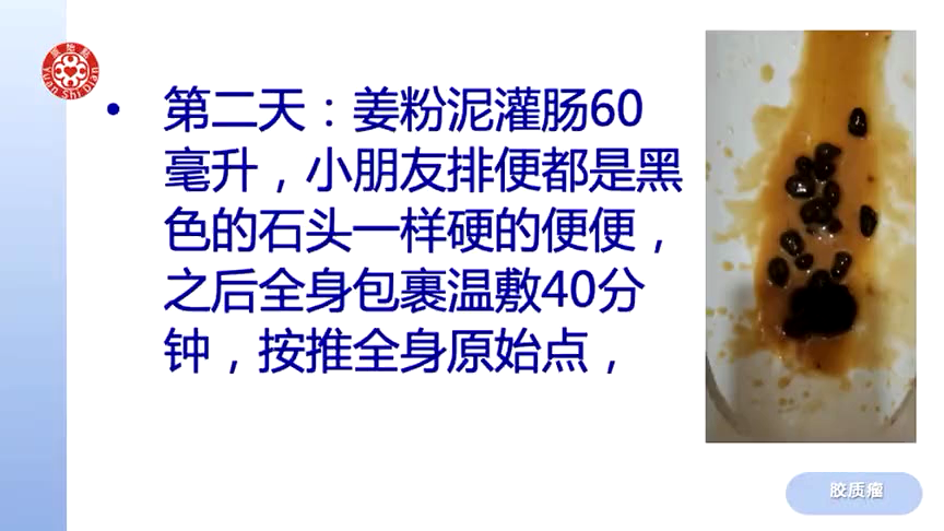 ·第二天:姜粉泥灌肠60毫升,小朋友排便都是黑色的石头一祥硬的便便,之后全身包裹温敷40分钟,按推全身原始点,头部用风简吹1小时,头部原始点可以用指腹轻轻按推了,小朋友说第一天处理完就没有头痛了,体力有改善一点点。