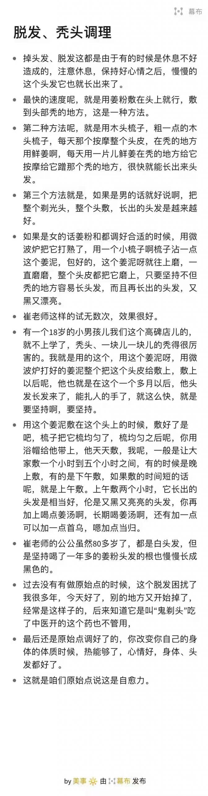 (编者注:头部头发的异常或症状,原始点讲因是体伤和热能不足。若要从因的调理改善,头部的姜疗外,还需配合原始点头部按推处理体伤效果更佳)