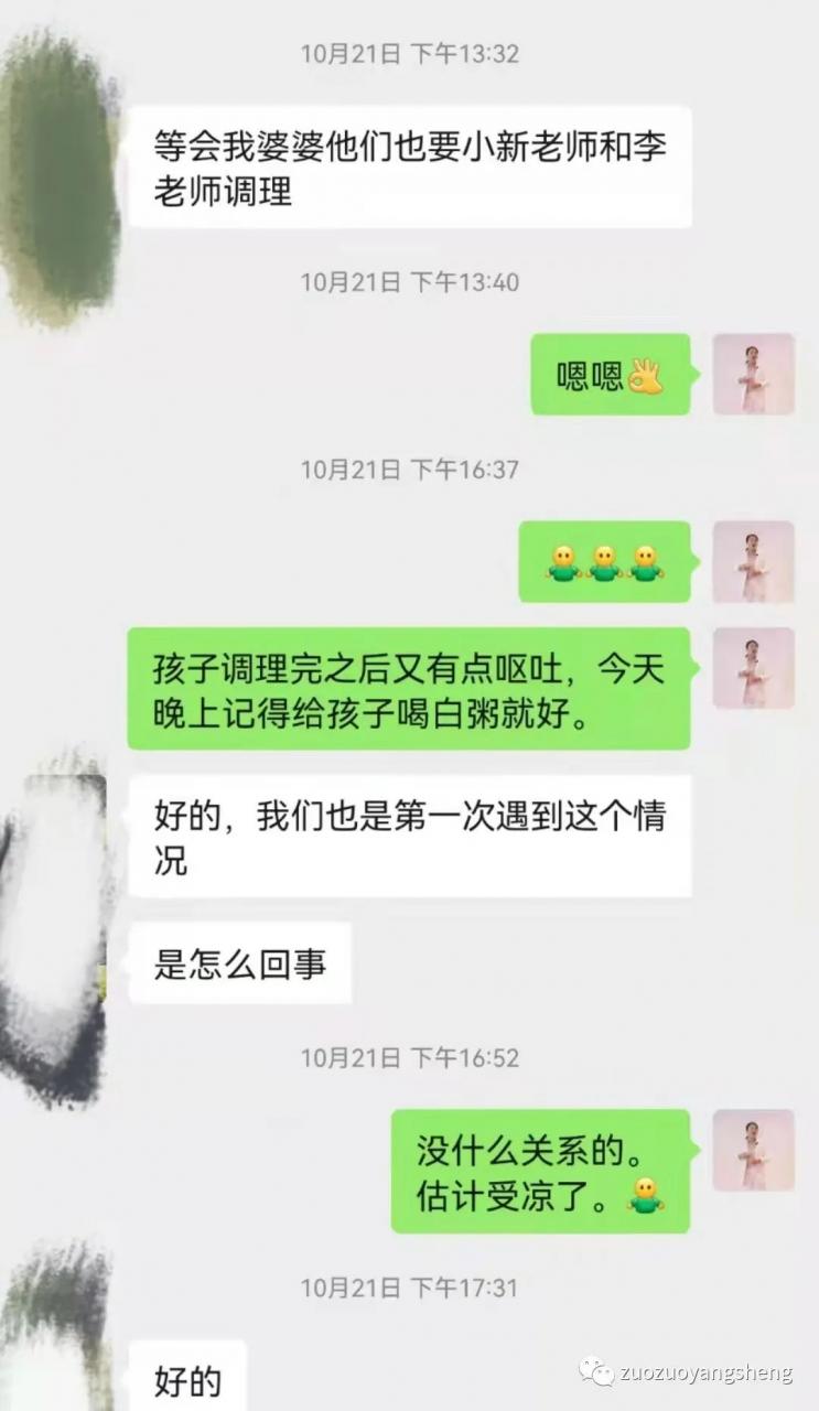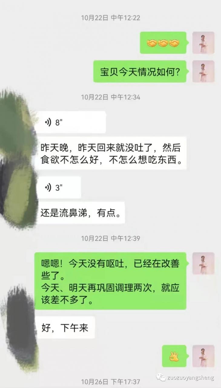 第二天中午(10月22日),发微信追踪宝贝情况,李女士说“昨天回去后,没吐了,食欲不怎么好,不想吃东西,有点流鼻涕。”孩子症状有改善,按推有效,让她不要太着急,再带宝贝过来巩固调理两次。