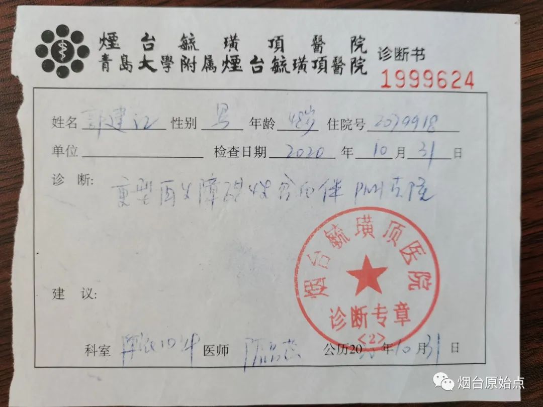 郭建江,男,50岁,山东烟台莱州人,2020年9月20号左右,同事说:“老郭,你这个脸为什么这么黄?”我当时以为是累的,就没有在意,当时我还跟一个朋友说:“不行找个老中医调理调理!”当时自己身体也没什么感觉,也没有在意,一直拖到2020年10月2号中午在单位吃饭的时候,我那个同事说:“老郭别找老中医调理了,赶快去上医院检查检查。”10月3号我就去烟台山医院南院去做了检查,检查结果当时就是血小板、白细胞、红细胞全都在往下将。当时医生说烟台山南院没有血液科,让去毓璜顶医院检查。我就再去和单位领导请假,我10月4号又去上了一天班,下午就去了毓璜顶医院,毓璜顶医院的大夫说南院查的结果不行,得需要再检查,我说好吧!结果当时一查血小板就剩8个。