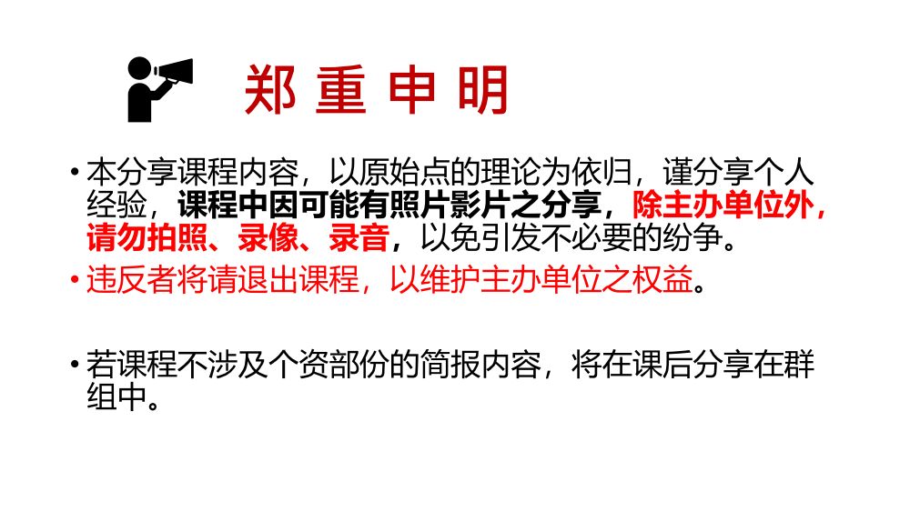 - 本分享课程内容,以原始点的理论为依归,谨分享个人经验,课程中因可能有照片影片之分享,除主办单位外,请勿拍照、录像、录音,以免引发不必要的纷争。