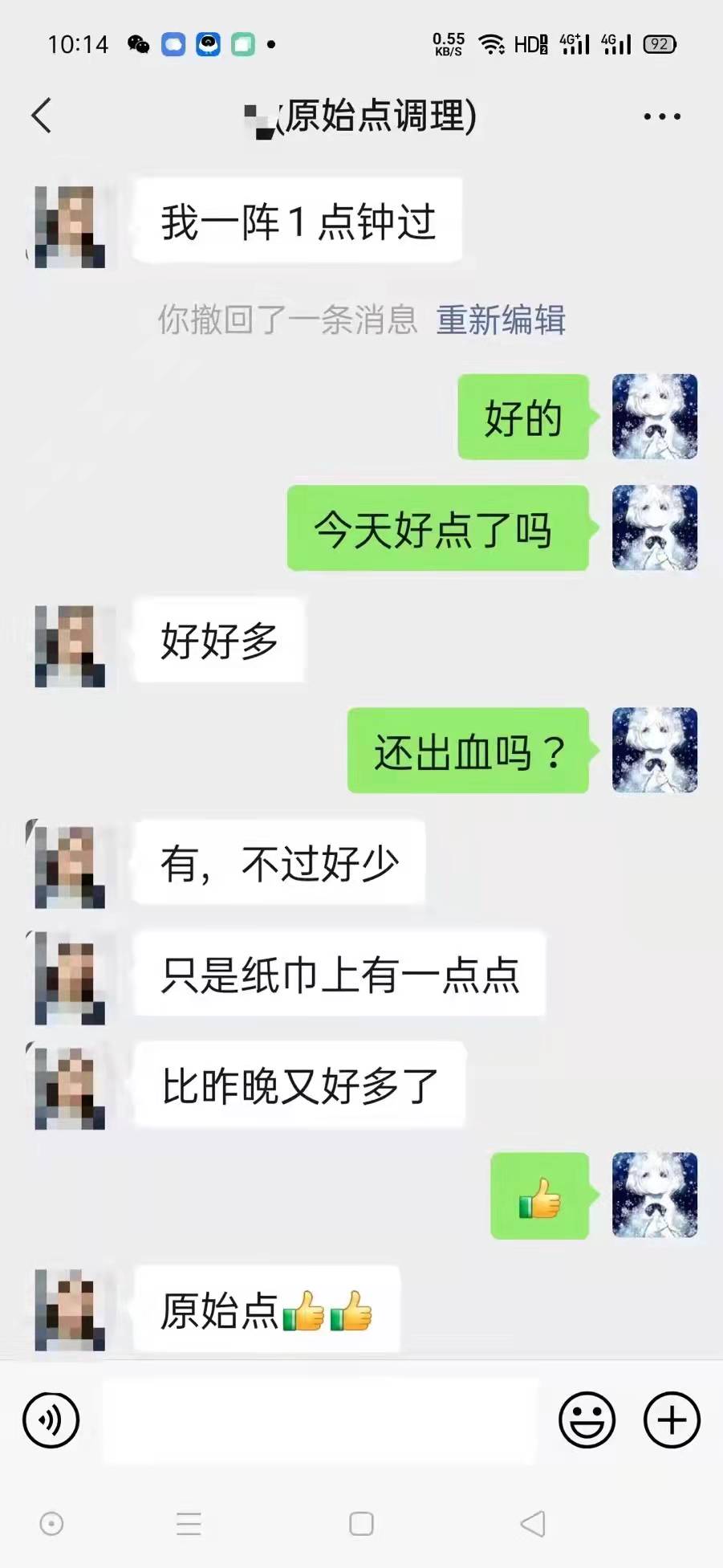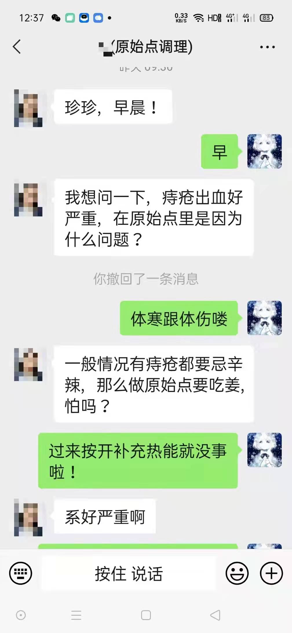 前天有个美女问:痔疮出血好严重,还很痛,在原始点里是因为什么问题?我跟她说所有疾病症状皆因体伤及热能不足所致,过来调理就是,没事的,我鼓励她过来 ,(她妈妈,妹妹也是原始点受益者,之前因为心脏早搏过来调理好了),出于对我们工作室的信赖,美女很听话马上就过来,调理了一次,按完问她感受怎样,她说已经没有来之前那么痛了。第二天上厕所已经没有 拉血,用纸巾擦时只有一点点,也不怎么痛了。今天第三次过来调理,说今天比昨天又好很多了,感恩张钊汉医师 无私的奉献 ,希望更多的人受益原始点。