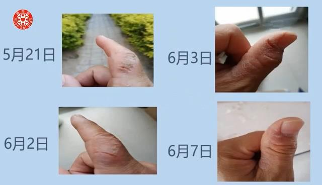 志工特别加强患处手指的按推,并要我补充参粉及有机姜丸,到了6月7日,手指开裂处已全部愈合,右手食指恢复正常粗细,皮肤变薄软,左手大拇指干癣也明显修复。