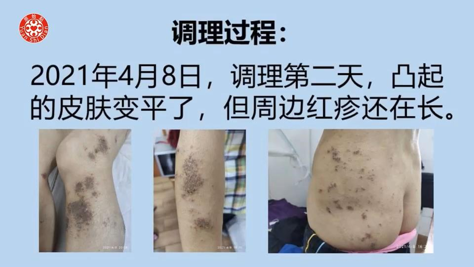 2021年4月8日,调理第二天,凸起的皮肤变平了,但周边红疹还在长。