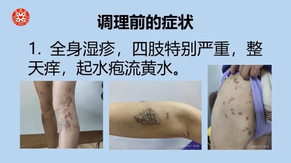 1.全身湿疹,四肢特别严重,整天痒,起水疱流黄水。