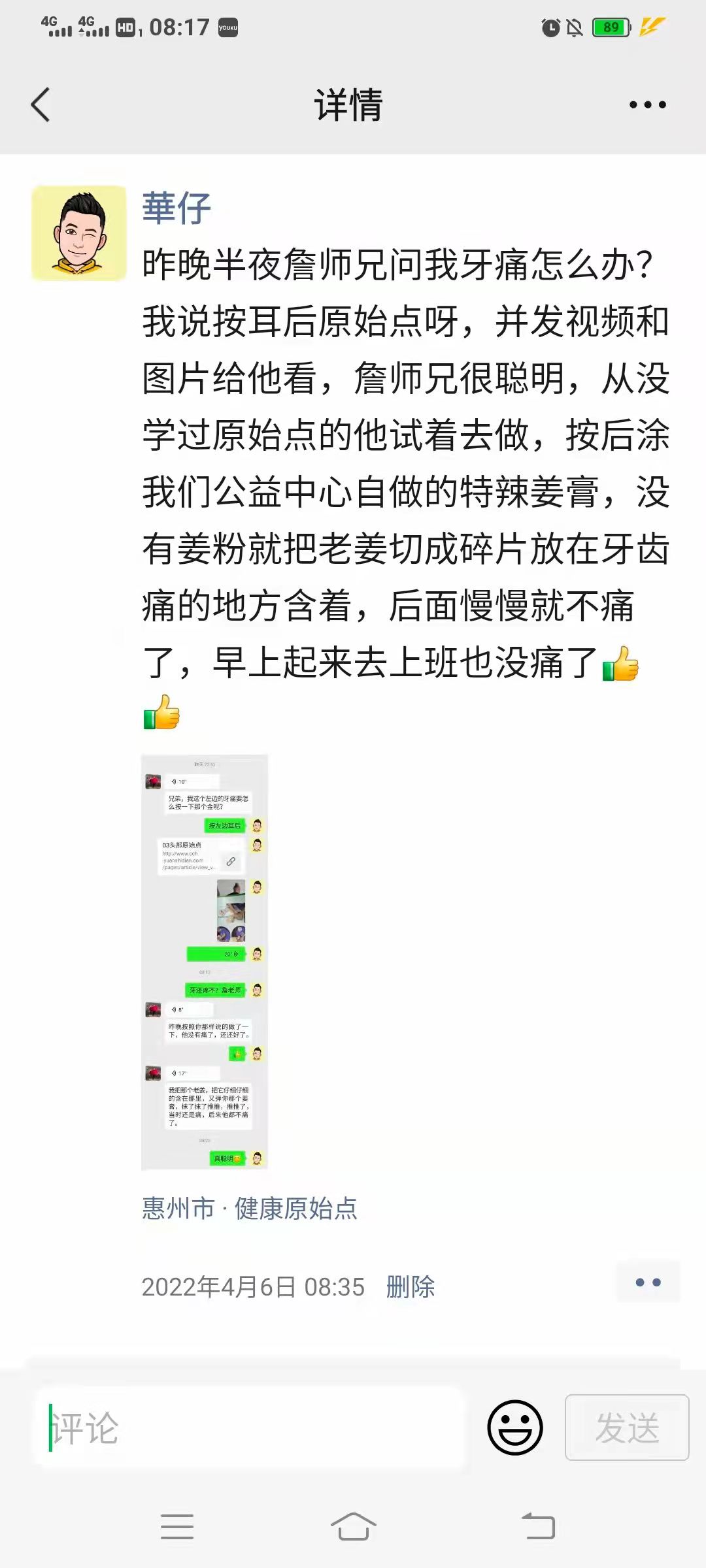 钟女士4月6号在家劈柴时不小心把腰扭伤,马上用红豆袋、姜神温敷,当天半夜感觉腰特别的痛。曾受益过原始点的钟女士(石碣公益原始点编号Z635)第二天跟詹老师讲,詹老师建议钟女士到公益点来处理,但当时钟女士痛的蹲不下也坐不下,去不了公益点,只好在家持续温敷,到下午四点多腰就没那么痛了,还可以去爬楼梯运动,今天4月8号早上起来时腰只剩一点痛,来到石碣公益点,志工用李氏开关技术给钟女士处理后,腰就一点都不痛了。