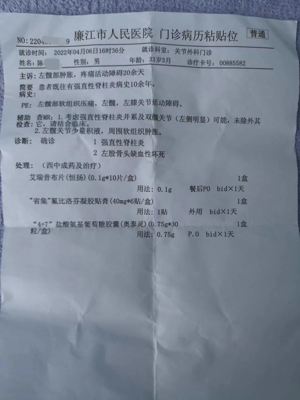 陈先生,男,今年34岁,广东廉江人,左侧股骨头坏死,不能走路约半个月,多个医院都说只能手术处理,手术费需要好几万块,主要症状是臀部和腿部剧痛,站不了、走不了、晚上痛的基本上睡不了、不能自主翻身,臀部、下肢每次的挪动甚至轻轻碰到都非常痛,上下床均需要人帮助,因为太痛,每次上床或下床的时间要超过半小时。既往有强直性脊柱炎12年,腰背痛疼,经常吃止痛药,吃了约六七年的激素。