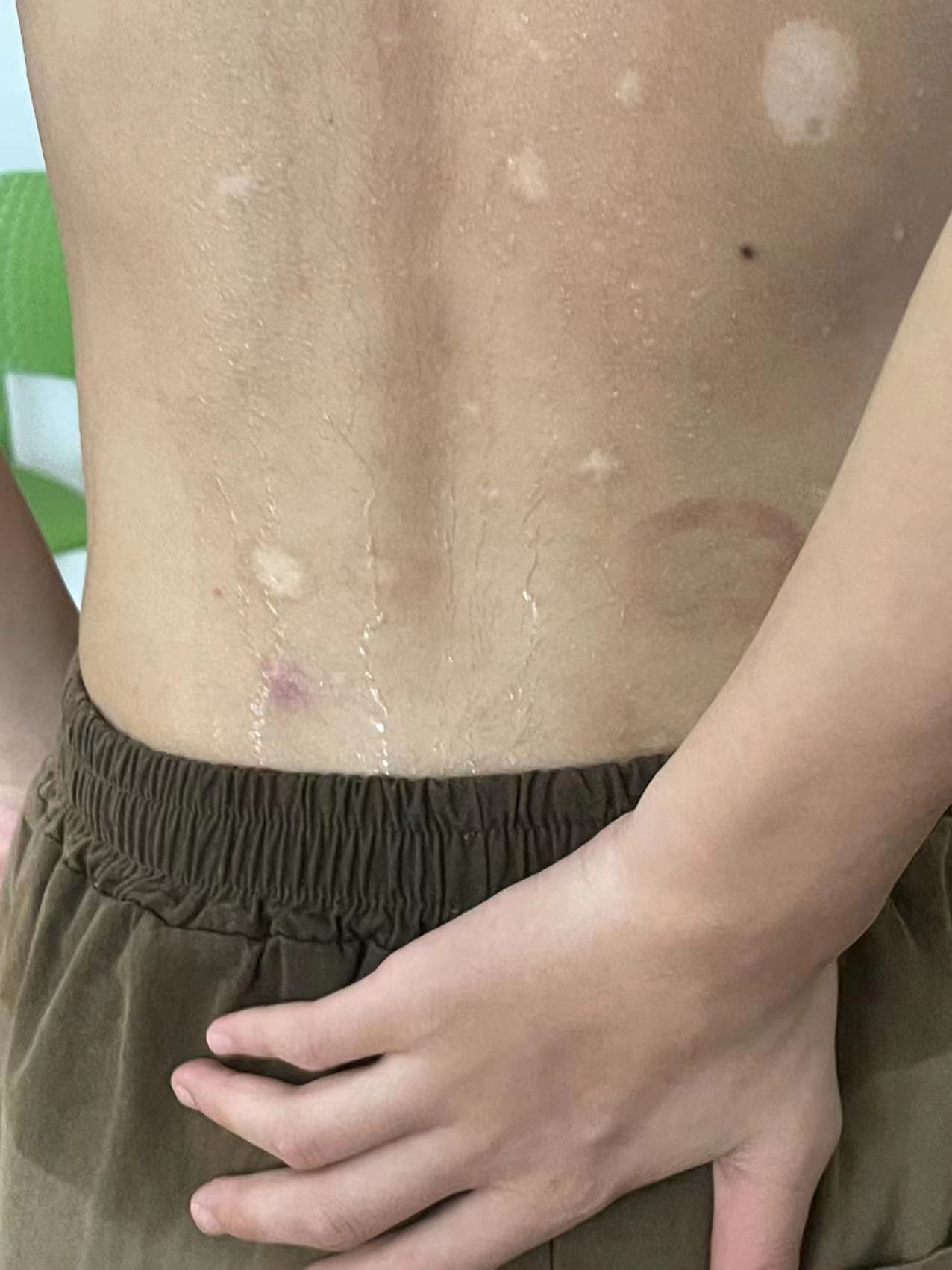 11岁的小邵因6个月时脑出血造成了左边偏瘫,去年9月份听说做电疗对偏瘫恢复有帮助,但做了电疗之后,后背的汗就特别特别的多,一天要换20多件衣服,晚上睡觉时床单、被套都是湿的,甚至在车内开着19-20度的空调,身上的汗也是一直不停的流,刚换的衣服,1~2分钟后就湿了,去医院检查过微量元素都是正常的,不缺钙不缺锌,甲状腺也正常,医生也找不出确定的原因,说可能是自主神经控制的问题;去找过几个老中医,吃过很多中成药,也去做过针炙,折腾了快一年,但出汗多的问题一直没有解决。2022年7月13号结缘惠州原始点(编号S225),志工邹师兄每天给小邵按推原始点后,先用红豆袋温敷,温敷后再搓姜粉,刚开始搓姜粉的时候,边搓姜粉、姜粉马上就湿了,姜粉湿透后就像芝麻糊一样往下流。原始点调理第4天汗多的情况开始好转,截止到7月22号小邵原始点按推共9次,小邵汗多的情况现已基本康复。