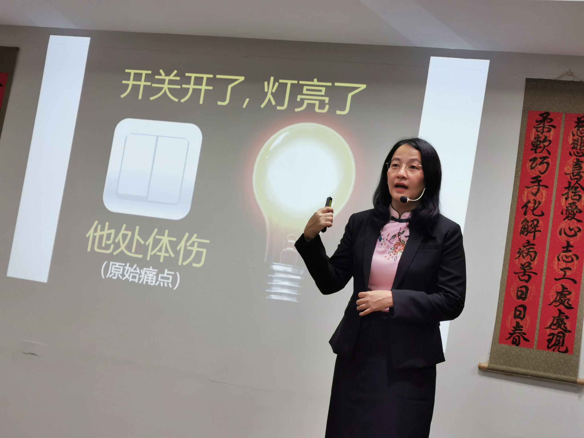 主讲人以进入漆黑房间开灯为例子,让学员更容易可以明白他出体伤及患处体伤的概念。