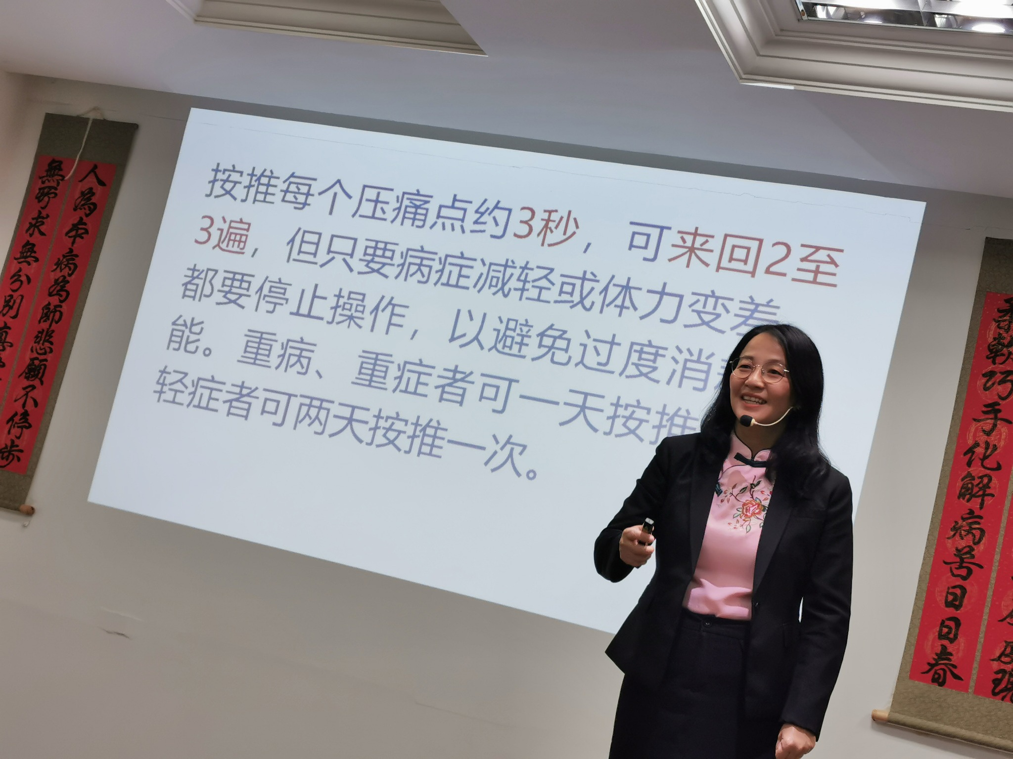 按推每个压痛点约3秒,可来回2至3遍,但只要病症减轻或体力变差,都要停止操作,以避免过度消耗热能。重病、重症者可一天按推两次;轻症者可两天按推一次。