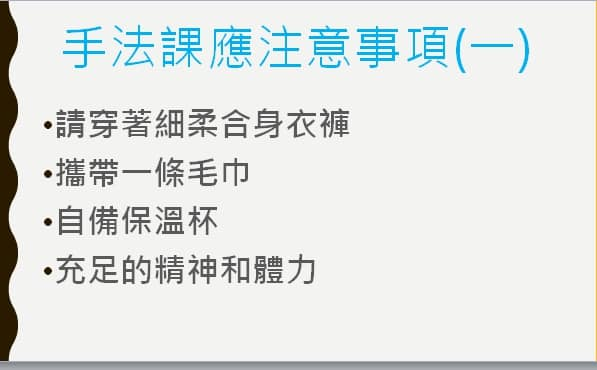 1.請穿著細柔衣褲、指甲剪短並自備一條毛巾及環保杯。