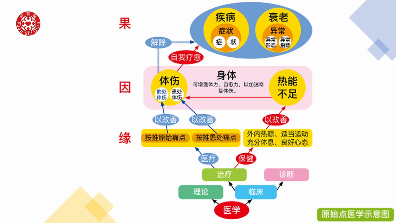 原始点医学在理论上,为了阐明疾病由来及防治,设定疾病与衰老为果,体伤及热能不足为因,按推、热源、适当运动、充分休息、良好心态为缘,并在临床上, 通过观察症状,用上述之缘,从因处理,以达到有病可保命及疗愈疾病;无病可抗老增寿、预防疾病。其中观察症状属诊断,按推属医疗,其余治疗方法则属保健。