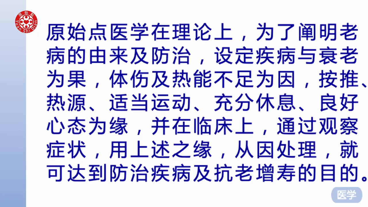 (19:05) 他们比较强调 就是快速治病 甚至他们检查出来的 不只他们谈要解决症状疾病 他们更在乎的是仪器检测出来的影像 里面他们把这些检查出来的 他们都当作病 即便是老也当成病 那在这种情况下 他们就不需要考虑到热能不足 也就是不需要改善体质 他们认为 就 他们就有办法 那这个後面医疗与保健会提 我就暂时点到这样 好那原始点医学这样一路探讨下来 从老跟病 再来看疾病之因 然後一路从按推开始找答案 还有外内热源 一路这样从下面做上来 那原始点就开始有一个 慢慢形成一个概念 原来我们临床上要治病