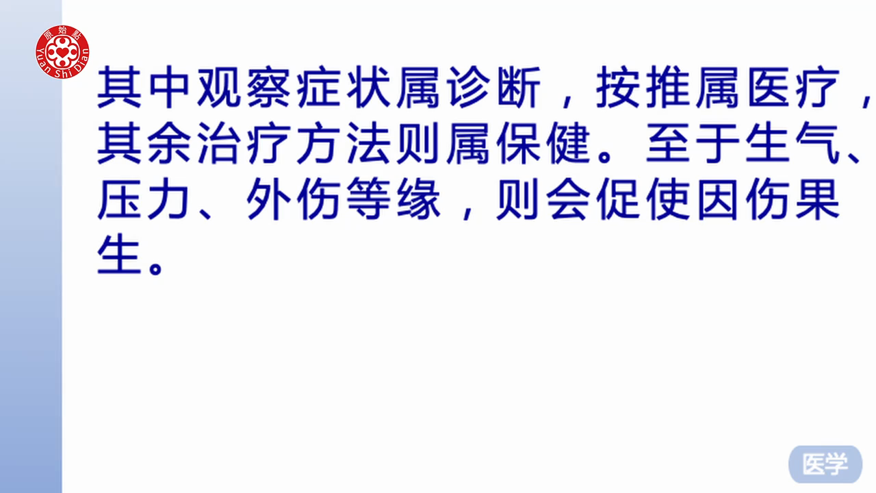 (20:10) 那治病的方式 一定还有医疗 还要有保健 才能达到改善疾病之因 才能做到最後因变果转 让疾病也可以得到适当的防治 还有衰老这一部分 也可以达到延缓衰老 然後生命也可以增长 所以就这个医学就慢慢这样形成了 那再来当然一个医学 除了这些治疗的方面 更重要你治疗还要有一个遵循的法则嘛 那在原始点的看法就是 这一部分原始点就是诊断 那西医是靠仪器 那原始点是靠 就是观察体表的种种变化 那在中医就是望闻问切啦 望闻问切跟原始点观察症状