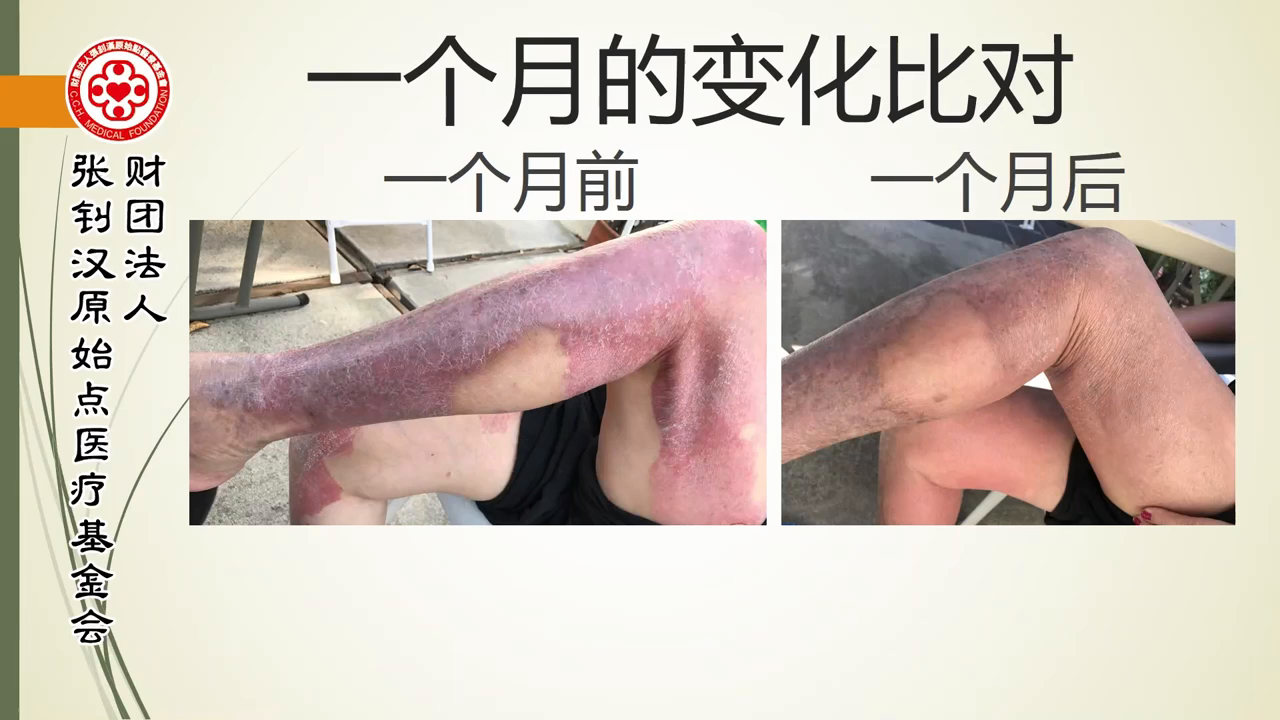 (55:38) 也有溃裂 淌水 淌水的时候 她那个厨房纸巾 把它包住 包住以後 那水淌的都湿答答的 然後又黏在皮肤上 然後穿的袜子 穿的鞋子 那个水都把鞋子里面都淌湿了 因为她知道 这一切都是修复的过程 所以她不担心 如果一个志工没有这个经验 唉唷真的 我不敢作 对不对哦 我们一没有信心 没有信心 一没有信心 她跟着就倒了 可以这麽说 这自然现象 第1个月作完 拍了这些相片 Grace跟我说一句话说 我觉得再过一个月我就会好 上个礼拜来我问她怎麽样 她说好像有一点 有新的疹子 好像又红肿 小块出来 背上呢 又开始有一点 不是那麽平了 我说这很好 好现象 你要记得一点啊 尤其是这麽重的患者 当她身体在恢复的时候 都是全方位的 所以後面还会 反反覆覆 反反覆覆 今天我又看到她背 又好多了 这些都是恢复现象 她现在自己感觉