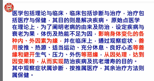 原文:医学包括理论与临床,临床包括诊断与治疗,治疗包括医疗与保健,其目的则是解决疾病。原始点医学在理论上,为了阐明老病的由来及防治,设定疾病与衰老为果,体伤及热能不足为因,按推、热源、适当运动、充分休息、良好心态为缘,并在临床上,通过观察症状,用上述之缘,从因处理,就可达到防治疾病及抗老增寿的目的。其中观察症状属诊断,按推属医疗,其实治疗方法则属保健。至于生气、压力、外伤等缘,则会促使因伤果生。