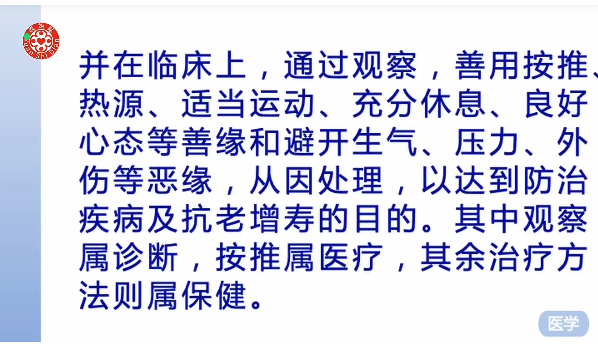 并在临床上,通过观察,善用按推热源,适当运动,充分休息,良好心态等善缘和避开生气、压力、外伤等恶缘,从因处理,以达到防治疾病及抗老增寿的目的。其中观察属诊断,按推属医疗,其实治疗方法则属保健。