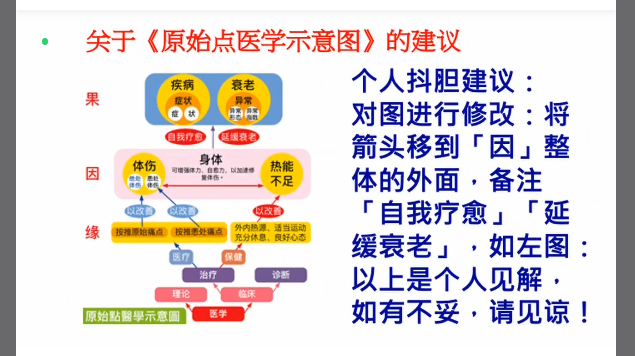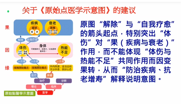 老师的这个原图,在“解除”与“自我疗愈”的箭头的起点,特别突出“体伤”对“果(疾病与衰老)”作用,但不能体现“体伤与热能不足”共同作用而因变果转,从而“防治疾病、抗老增寿”解释说明意图。