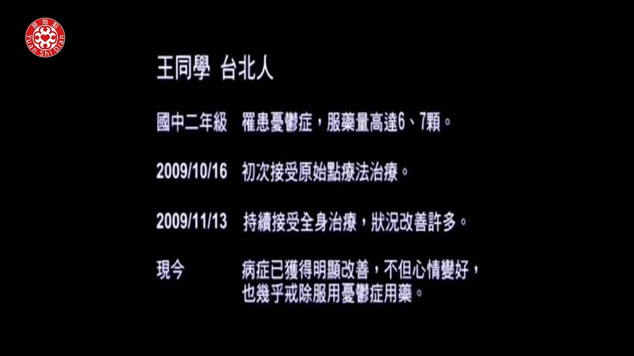 用原始点是最快,又可以把西药戒掉,要不然忧郁症一吃就要吃好多年、长期的。按完 心情开朗之后再心理辅导,一下子就可以很快让他恢复,像这一个同学他学校就讲,他说他辅导学生那么久,没有一个好过,竟然用原始点能够把他解决,他们学校也觉得不可思议。