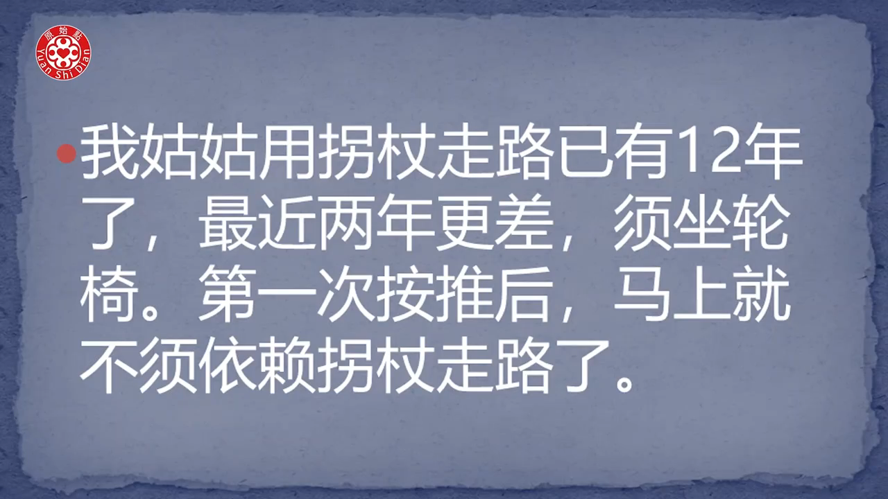 我姑姑用拐杖走路已有12年了,最近两年更差,须坐轮椅。第一次按推后,马上就不须依赖拐杖走路了。