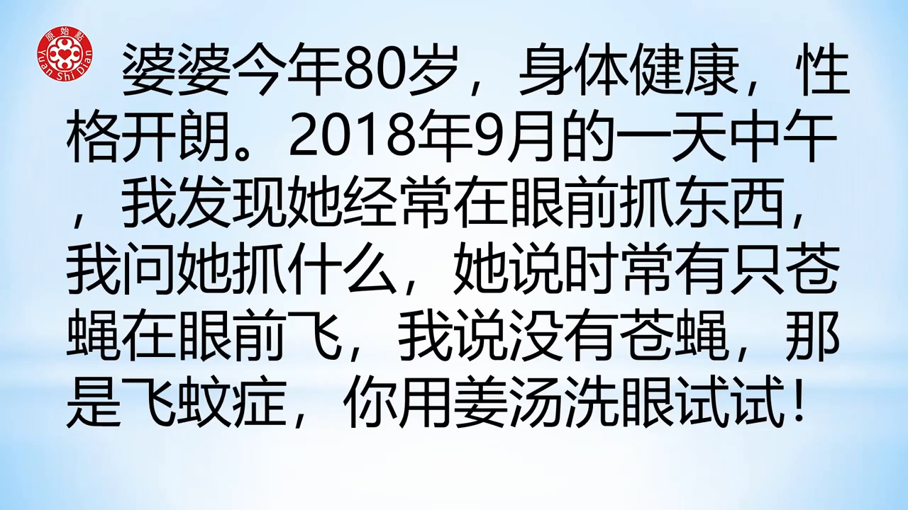 我问她抓什么,她说时常有只苍蝇在眼前飞,我说没有苍蝇,那是飞蚊症,你用姜汤洗眼试试!