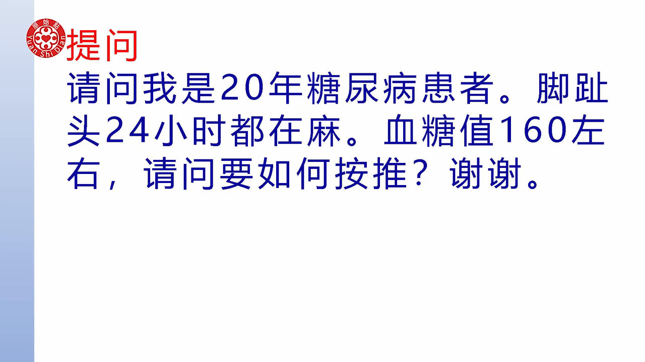 请问我是20年糖尿病患者。脚趾 头24小时都在麻。血糖值160左 右,请问要如何按推?谢谢。