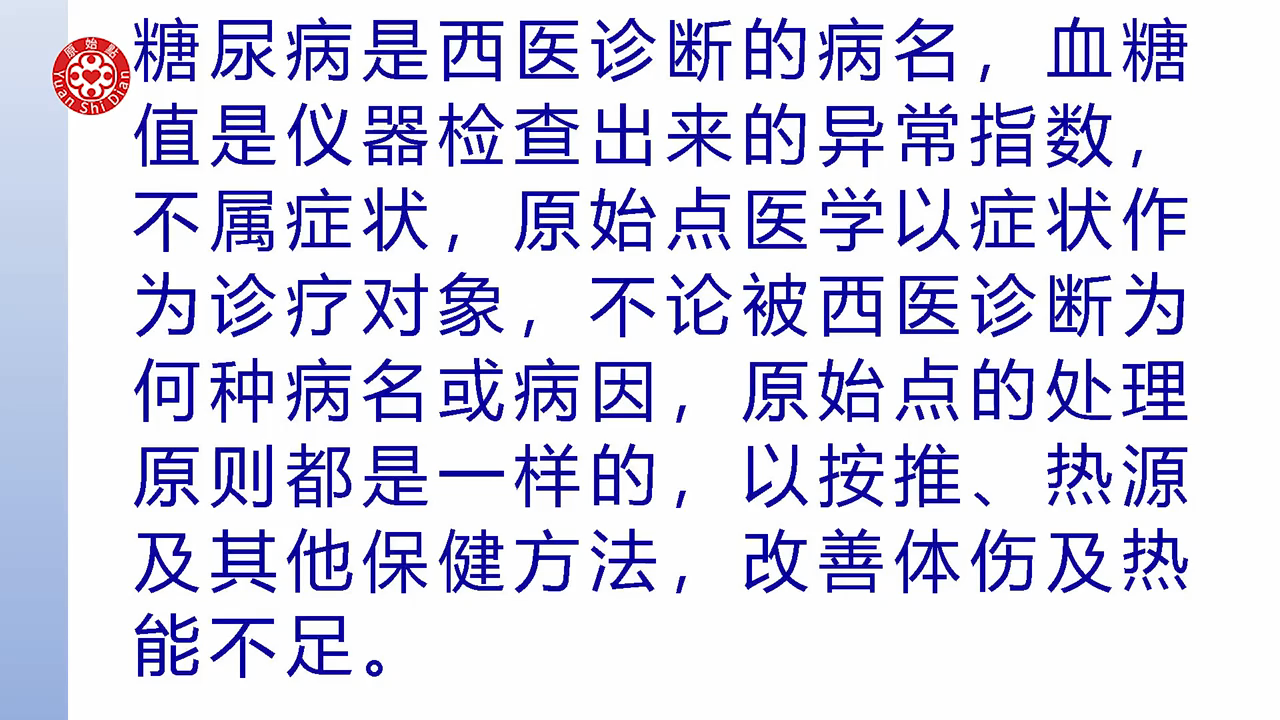 答:糖尿病是西医诊断的病名,血糖 值是仪器检查出来的异常指数, 不属症状,原始点医学以症状作 为诊疗对象,不论被西医诊断为 何种病名或病因,原始点的处理 原则都是一样的,以按推、热源 及其他保健方法,改善体伤及热 能不足。