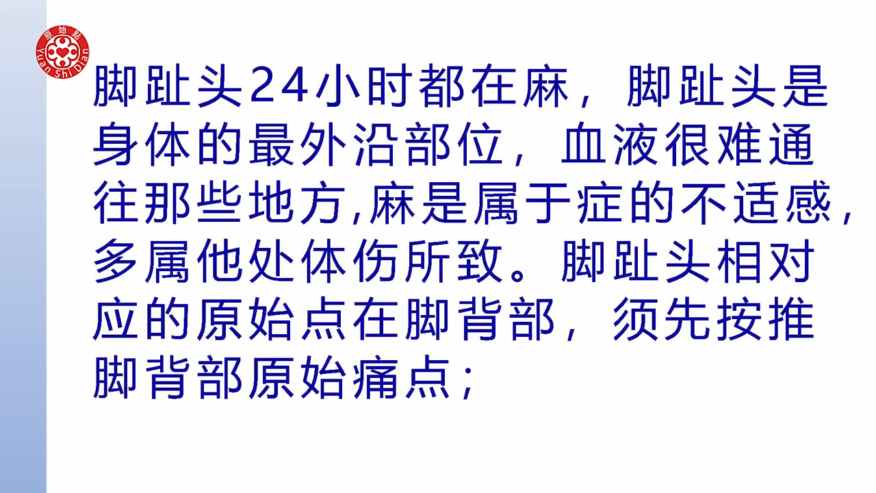 脚趾头24小时都在麻,脚趾头是 身体的最外沿部位,血液很难通 往那些地方,麻是属于症的不适感, 多属他处体伤所致。脚趾头相对 应的原始点在脚背部,须先按推 脚背部原始痛点;
