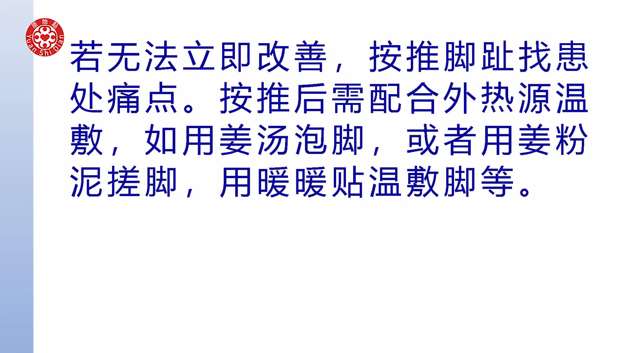 若无法立即改善,按推脚趾找患 处痛点。按推后需配合外热源温 敷,如用姜汤泡脚,或者用姜粉 泥搓脚,用暖暖贴温敷脚等。