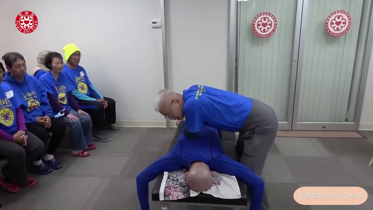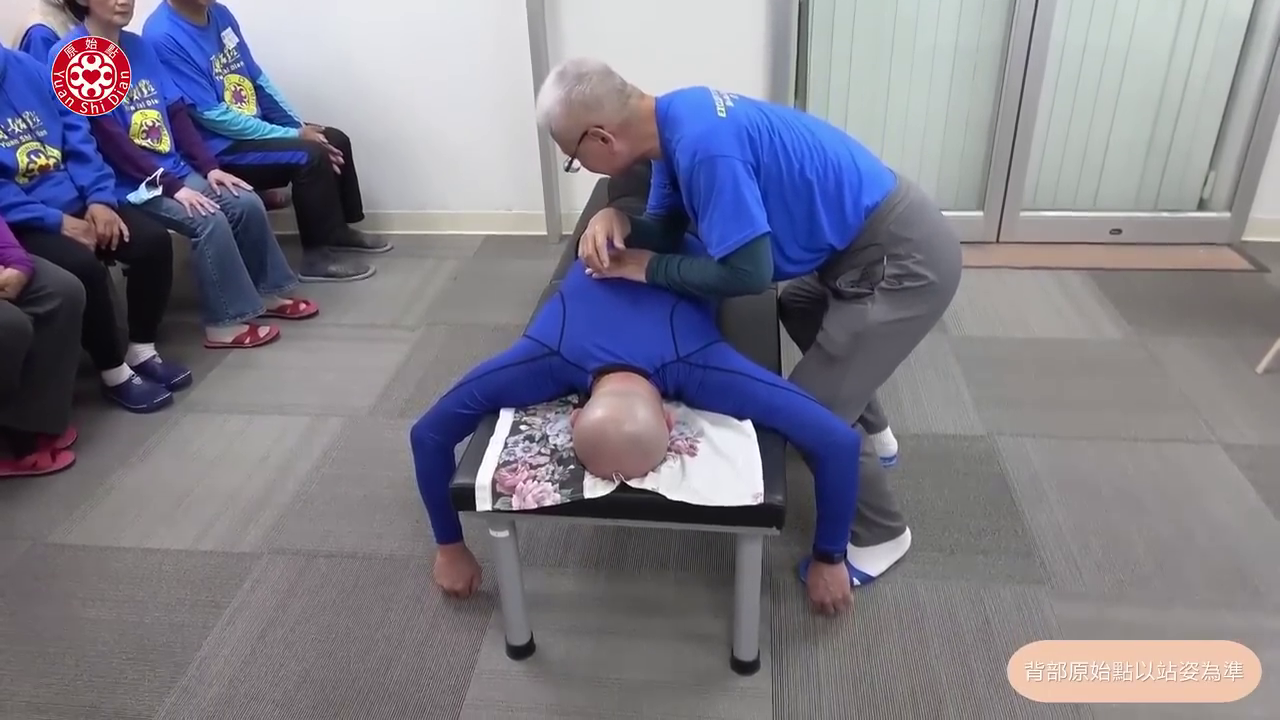 (00:30) 上背部我的建议是坐姿 好 那我们采取坐姿 坐姿的话要注意的就是 你按下去的第一点 我发现也是这两天来 这里的志工容易犯的 他第一点都按到这里来 不对 第一点是在肩颈结合处 是在下面 所以正确是 肩膀到颈椎的交叉点 你们揉到上面来一定是错 好那第一点找到了 第一个手放这里 然後同侧是这里 所以你们注意 我这样顶下来 往後顶 这样才能顶得到 然後已经下去了 当你放在这里一定是错 第一点一定是这样 好那这样 有一点由下往上勾起来的味道 这是第一点