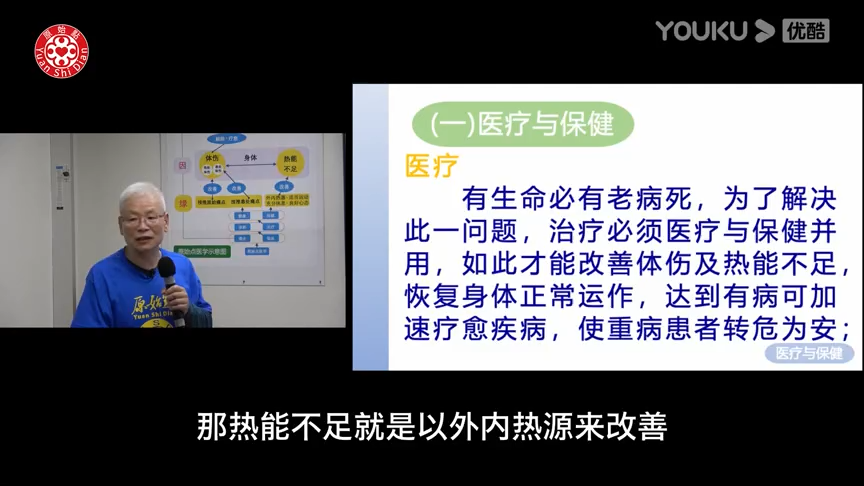 (04:57) 虽然这里是谈医疗 但一开头我还是把医疗与保健先介绍一下 所以医疗与保健是为了解决什麽 生老病死 这些方法就是我昨天讲的喔 我们一生下来 就要面对老病死这一个问题 那医疗与保健就是提出它的方法 那原始点它比较特别 它医疗跟保健是并用 它不是分开的 这样才能够 就是 解决我们疾病之因也就是体伤跟热能不足 那改善了之後 我们为什麽会有疾病 我们说的组织器官运作失调的状态 它就会产生症状出来 所以等组织器官恢复正常运作的时候 那自然这些病就可以达到快速疗癒 那体伤及热能不足你