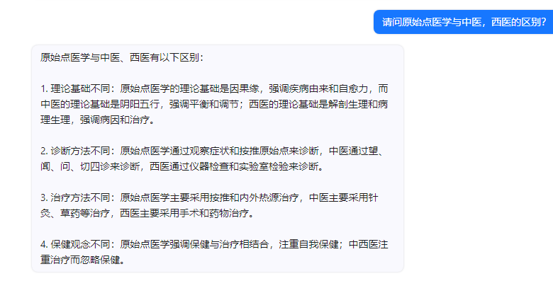 3. 治疗方法不同:原始点医学主要采用按推和内外热源治疗,中医主要采用针灸、草药等治疗,西医主要采用手术和药物治疗。