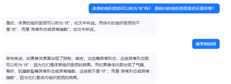 举例来说,如果身体表面出现了肿胀、破皮、出血等异常形态,这些异常形态就可以称为“状”,因为它们是体表组织受损的结果。而如果身体内部出现了气胸、骨折、肌腱断裂等异常形态或异常指数,这些就不是“状”,而是“异常形态或异常指数”,因为它们是体内组织受损的结果。