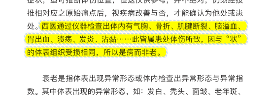 如何理解“西医通过仪器检查出体内有气胸、骨折、肌腱断裂、脑溢血、胃出血、溃疡、发炎、沾黏⋯⋯此皆属患处体伤所致,因与“状”的体表组织受损相同,所以是病而非老。