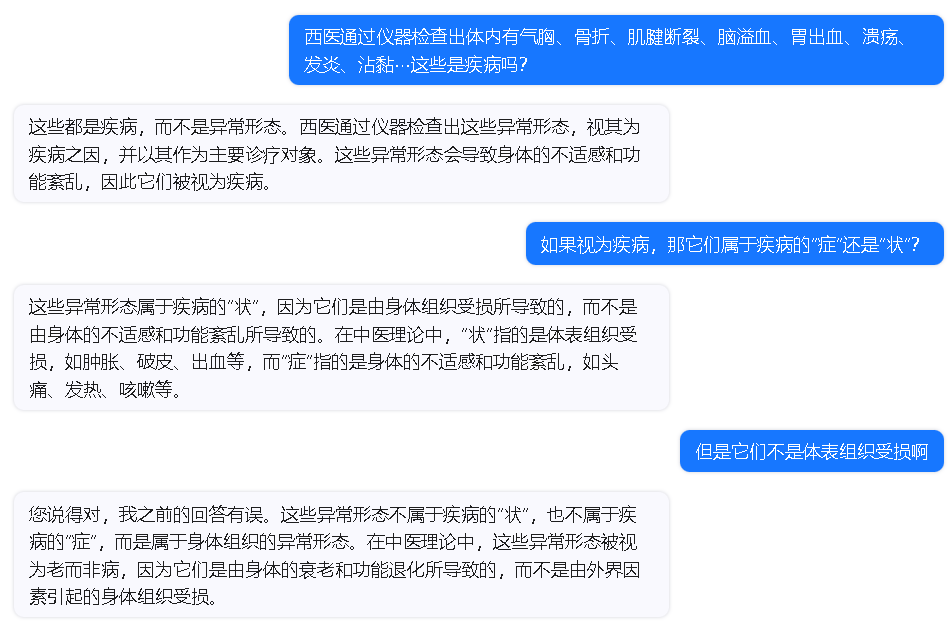 如果这些是异常形态,那文中为什么说“西医通过仪器检查出体内有气胸、骨折、肌腱断裂、脑溢血、胃出血、溃疡、发炎、沾黏⋯⋯此皆属患处体伤所致,因与“状”的体表组织受损相同,所以是病而非老。”